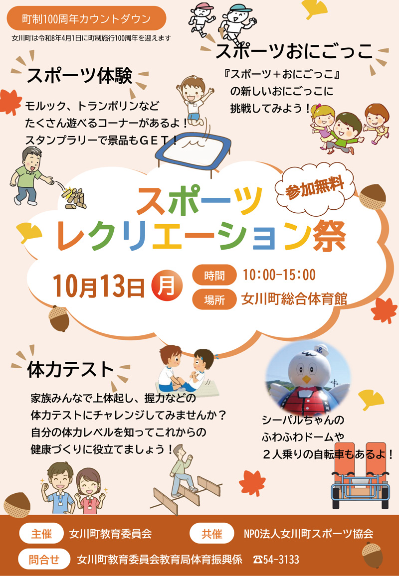 女川町総合体育館にて「スポーツレクリエーション祭」を開催します! 今回は町制100周年カウントダウン事業の一環として、子どもから大人まで楽しめる多彩なプログラムをご用意しました。